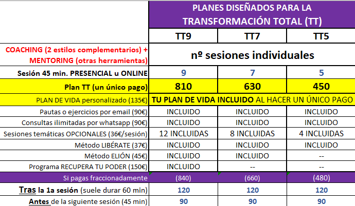 Una sesión puntual son 105€. Si inviertes en un Plan TT, además del descuento en precio, tienes otros servicios añadidos. En todos los planes, combino lo mejor del coaching con +15 herramientas de otras disciplinas (mentoring).